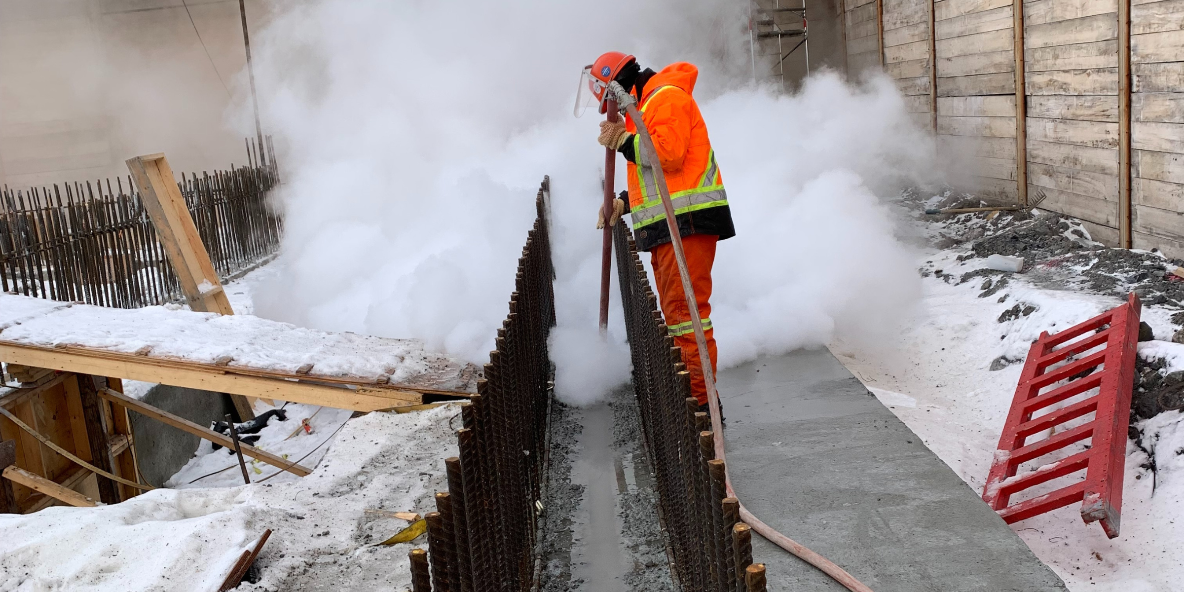 Excavac de-ices concrete slabs, reinforcement, formwork, concreting areas and other critical surfaces. By combining different techniques, including hot water, dry steam and snow removal, we ensure uniform and safe surface preparation.